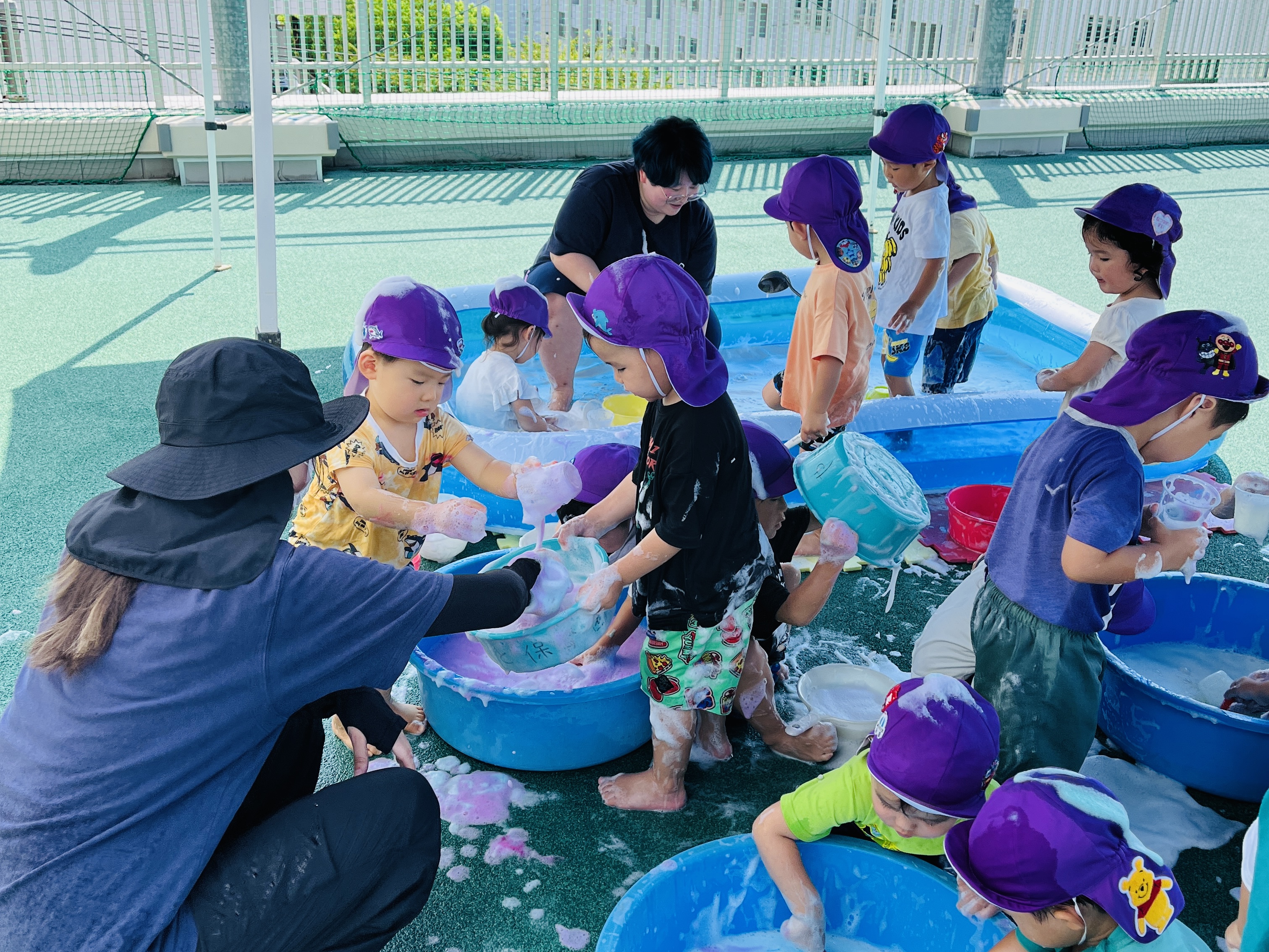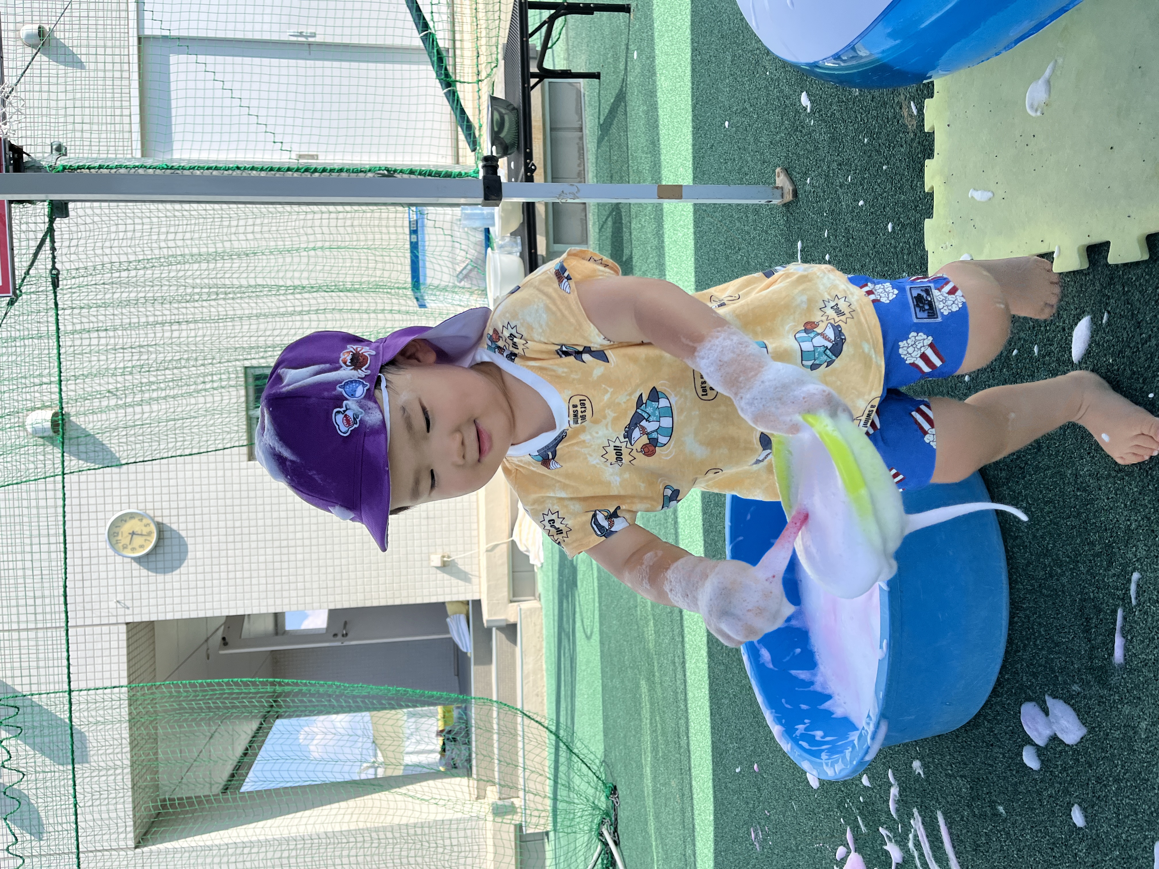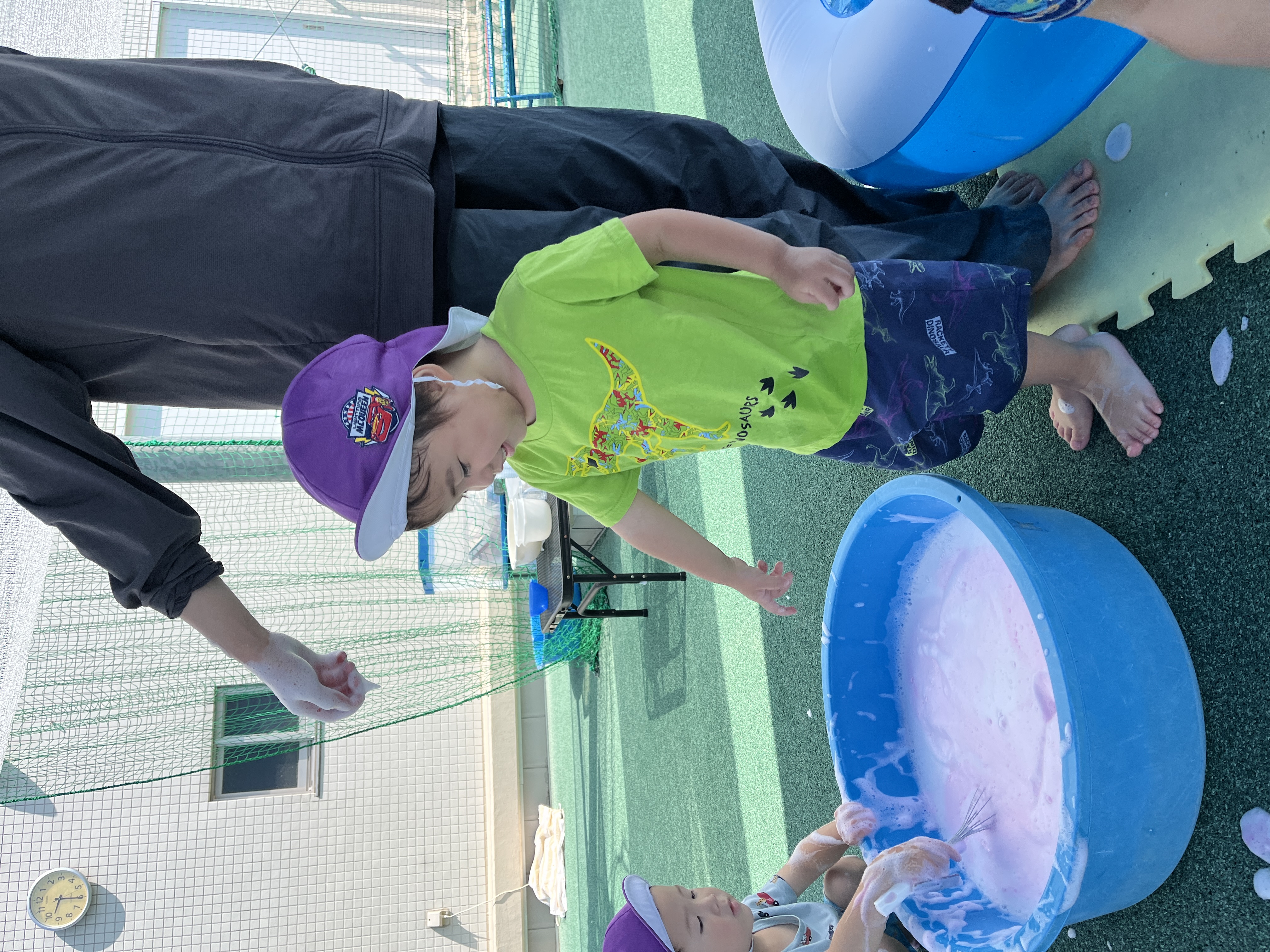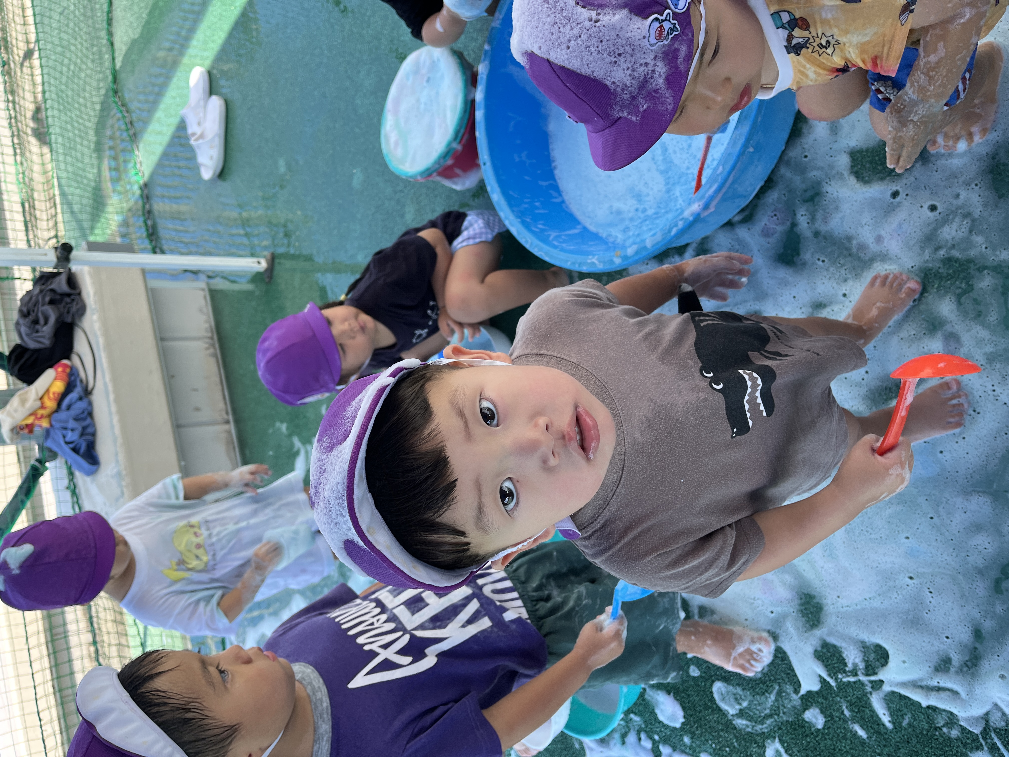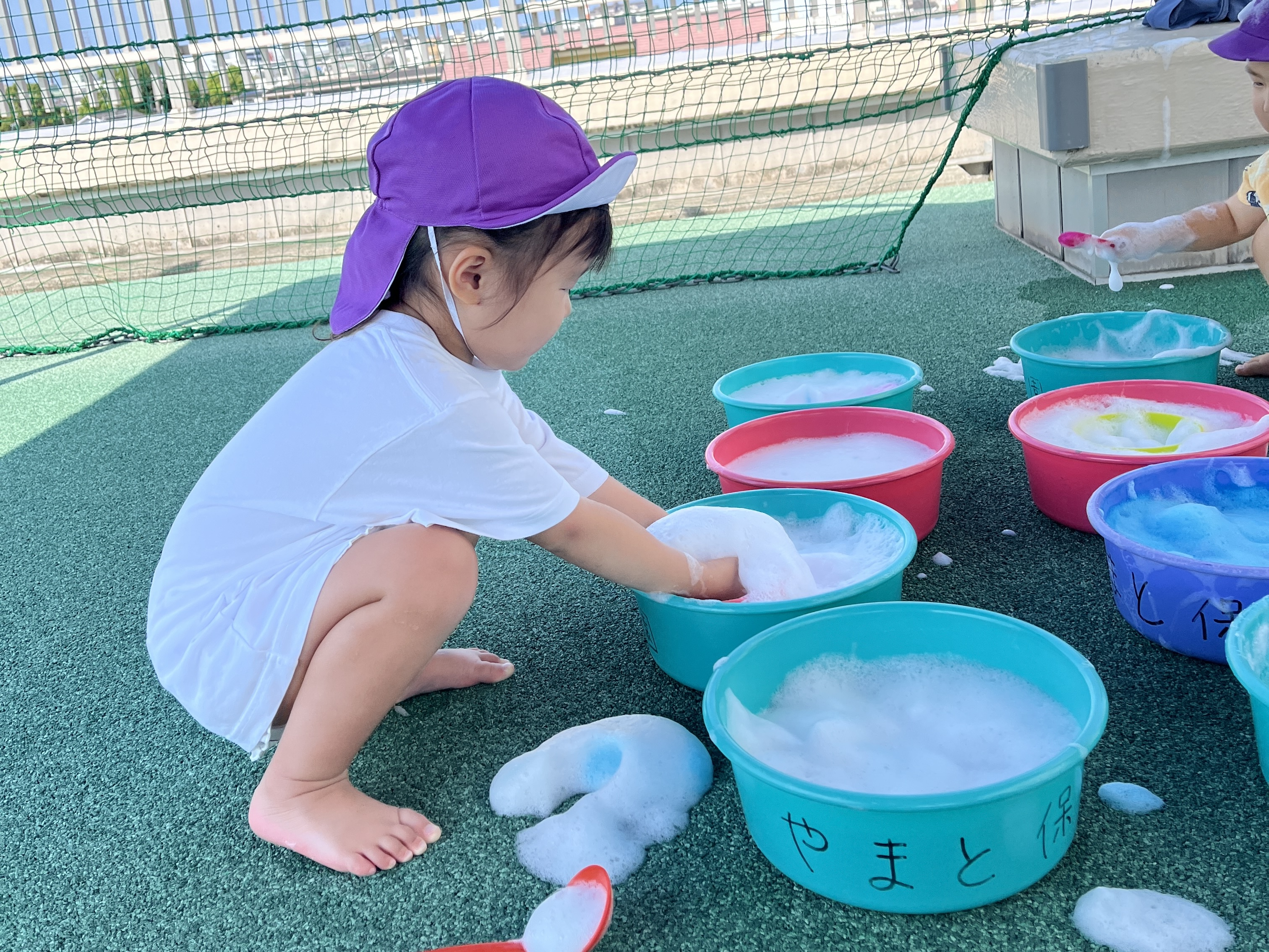 道具を使ってもっと泡立ててみたり、色が付いた泡で遊びました。