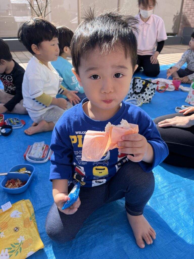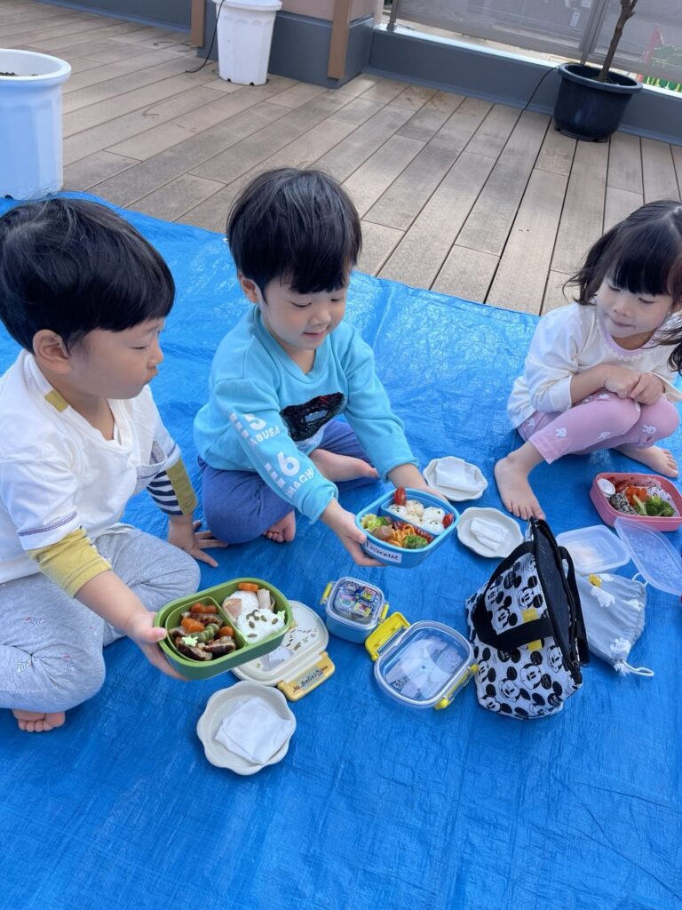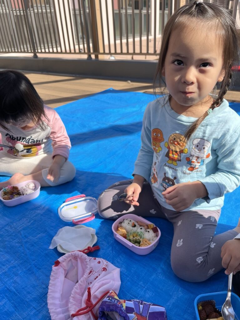 登園してすぐ、「何が入ってると思う?」「今日はからあげ!」「おにぎりはいってるよ!」と、嬉しそうにおべんとうのおはなしをしていましたよ♪