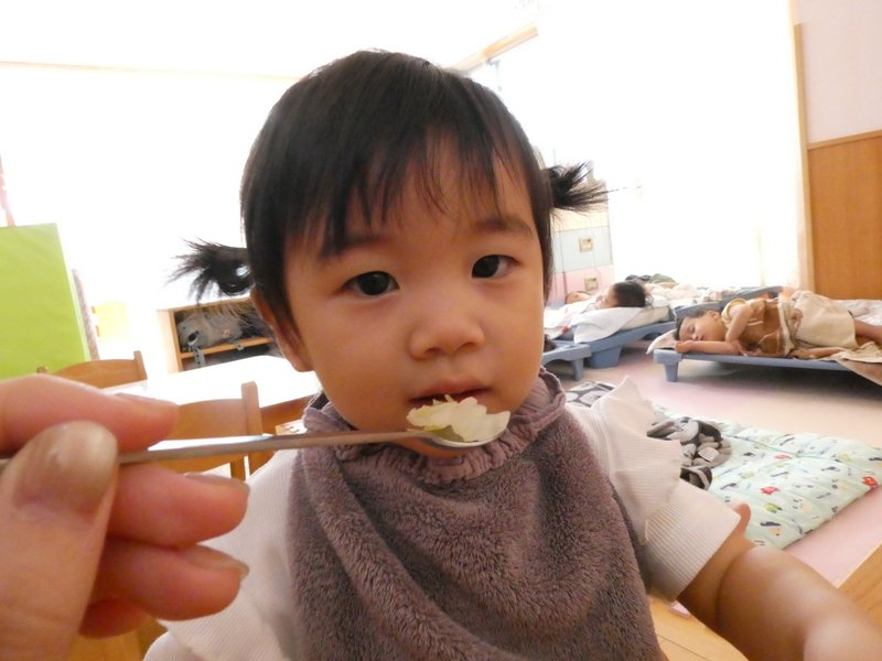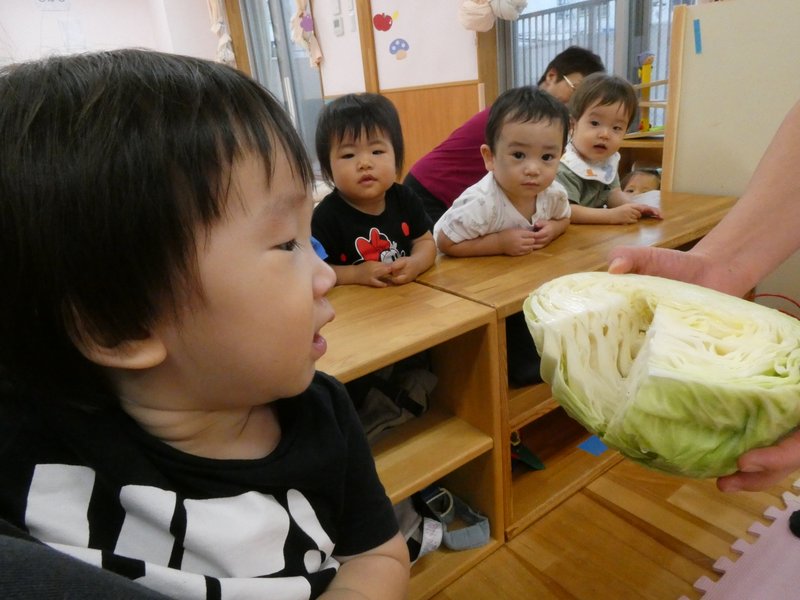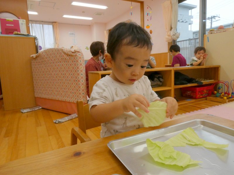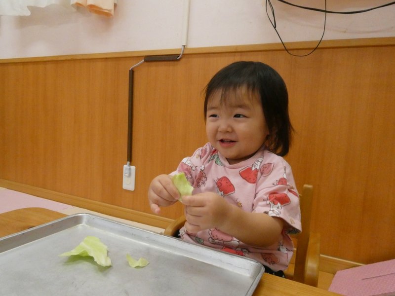 給食のスープに入れるキャベツをちぎってお手伝いをしました。