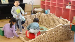 積木コーナーでは、皆が入れるほど大きなお家が出来たり、「動物園つくろ~」と動物園を作ったりと